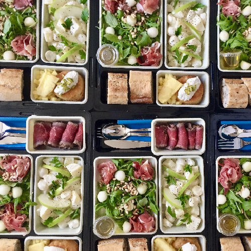 Livraison d'un repas cuisiné dans notre laboratoire, présenté sous forme de buffet de plats à partager ou dressé dans vos assiettes.